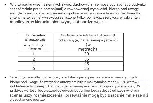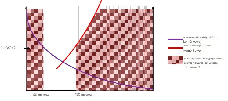 Wykres szacunkowych bezpiecznych odległości od stacji nadawczych telefonii komórkowych; kiedy nasz własny telefon emituje do naszego ciała więcej, niż wieża?